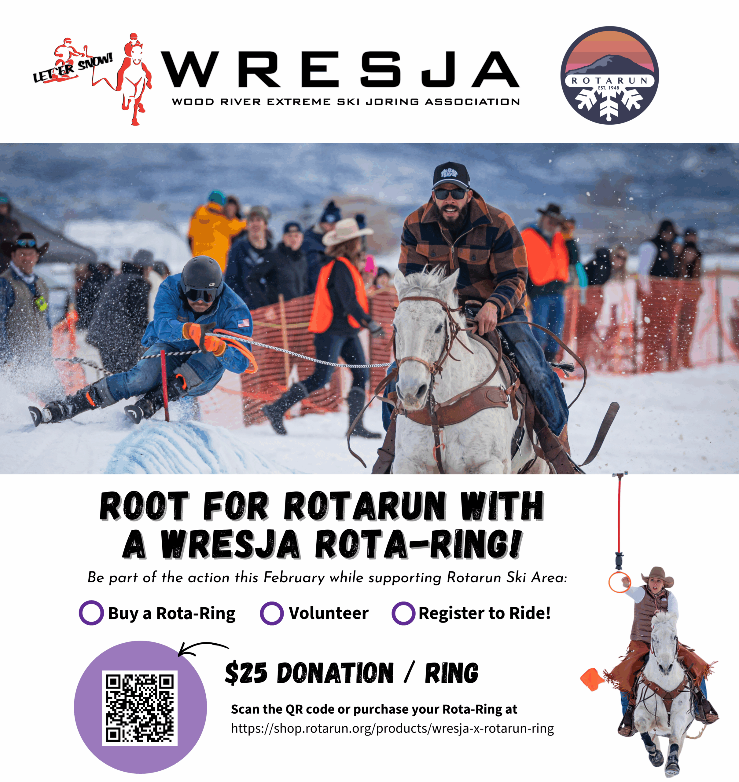 You can help support Rotarun as one of the three non-profit beneficiaries of the 2026 Wood River Ski Joring races by purchasing a race ring for $25! The event takes place February 14-15 in Bellevue, ID.